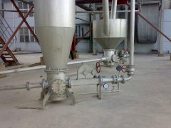 当气力输送设备进行工作时物料进入料封泵体满后,经过气化管使物料形成一种流化状态,顺利进入混合室,同时高压气体经射流喷嘴高速喷出,与流态化物料充分混合均化,高速气流带着物料经过拉伐尔管进行能量转换后沿输送管道运动,即完成物料的输送。